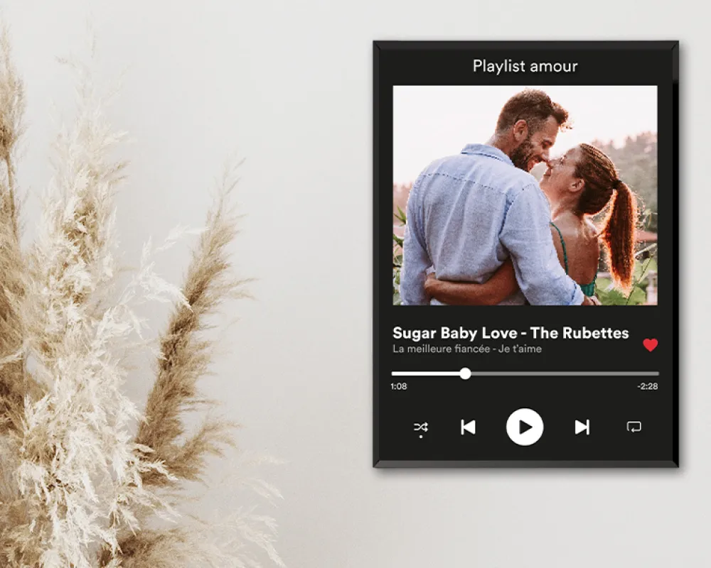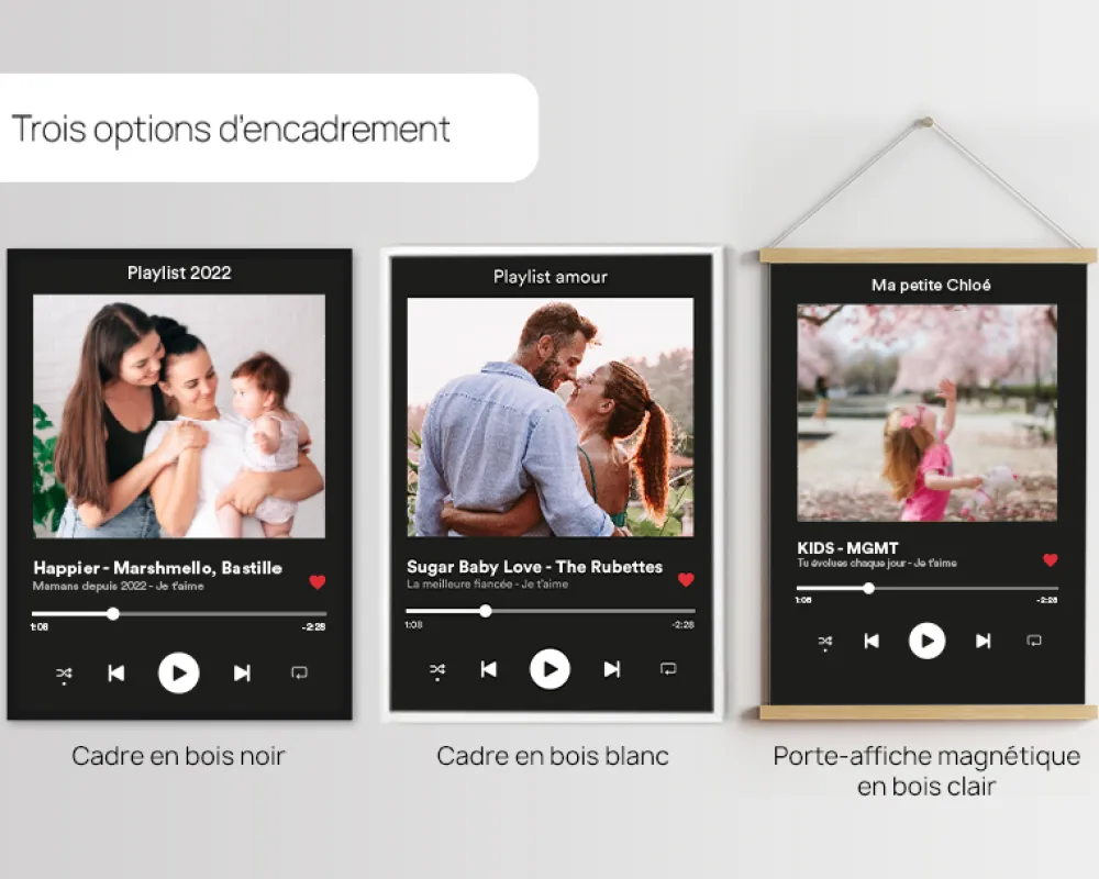 Et comme on ne fait pas les choses à moitié, vous pouvez ajouter vos noms, le titre de la chanson qui vous fait vibrer, ou même un message perso pour un clin d’oeil original à la personne à qui vous l’offrirez. En plus, on vous propose trois styles d’encadrement au top : cadre noir classe, cadre blanc stylé, ou baguettes magnétiques en bois pour une touche moderne.
