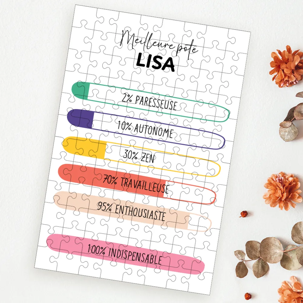 Ce puzzle personnalisé ne se contente pas de faire passer un bon moment : il raconte une histoire. Grâce à ses barres colorées inspirées des pourcentages, il met en lumière les qualités, passions ou petites habitudes de son destinataire, ligne après ligne. À personnaliser avec cinq descriptions uniques, suivies d’un dernier mot plein d’amour, comme 100% inoubliable. Les pourcentages sont fixes, seul le texte est à personnaliser pour un rendu à la fois drôle et touchant.