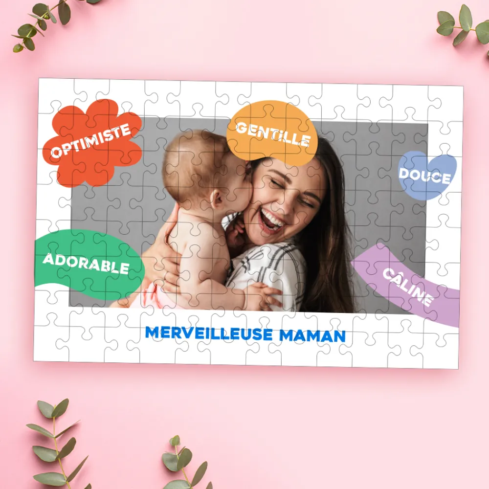 Avec sa photo centrale entourée de bulles personnalisables remplies de qualités et de mots doux, ce puzzle devient bien plus qu’un simple jeu : un hommage coloré et pétillant à une maman exceptionnelle. Un petit message personnalisé complète cette création pour en faire un cadeau original et touchant.