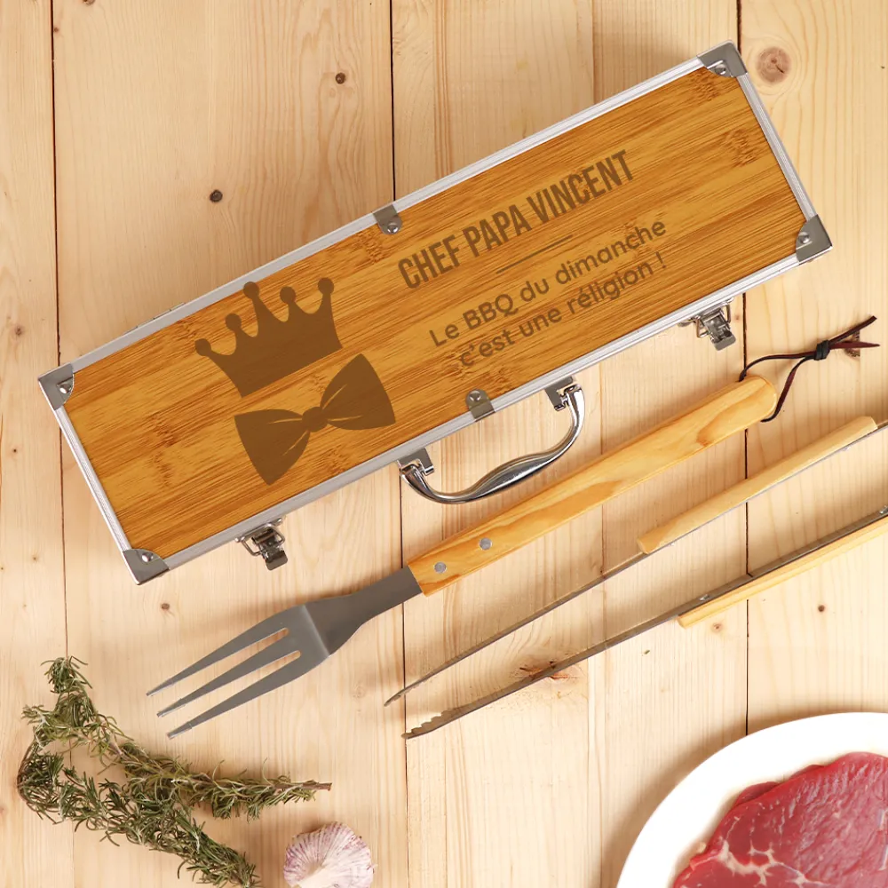 Dans ce coffret barbecue gravé papa, tout a été pensé pour lui faire plaisir. Une spatule, une fourchette à découper et une pince, en acier inoxydable avec des poignées en bambou, l’équipent pour préparer des grillades dignes d’un chef ! Et pour encore plus de style, le tout est rangé dans une mallette en aluminium et bambou, avec la possibilité d’y graver un message spécial. Vous pouvez personnaliser ce set barbecue message pour papa avec un texte tendre ou amusant, qui lui rappellera à chaque barbecue combien il est apprécié.