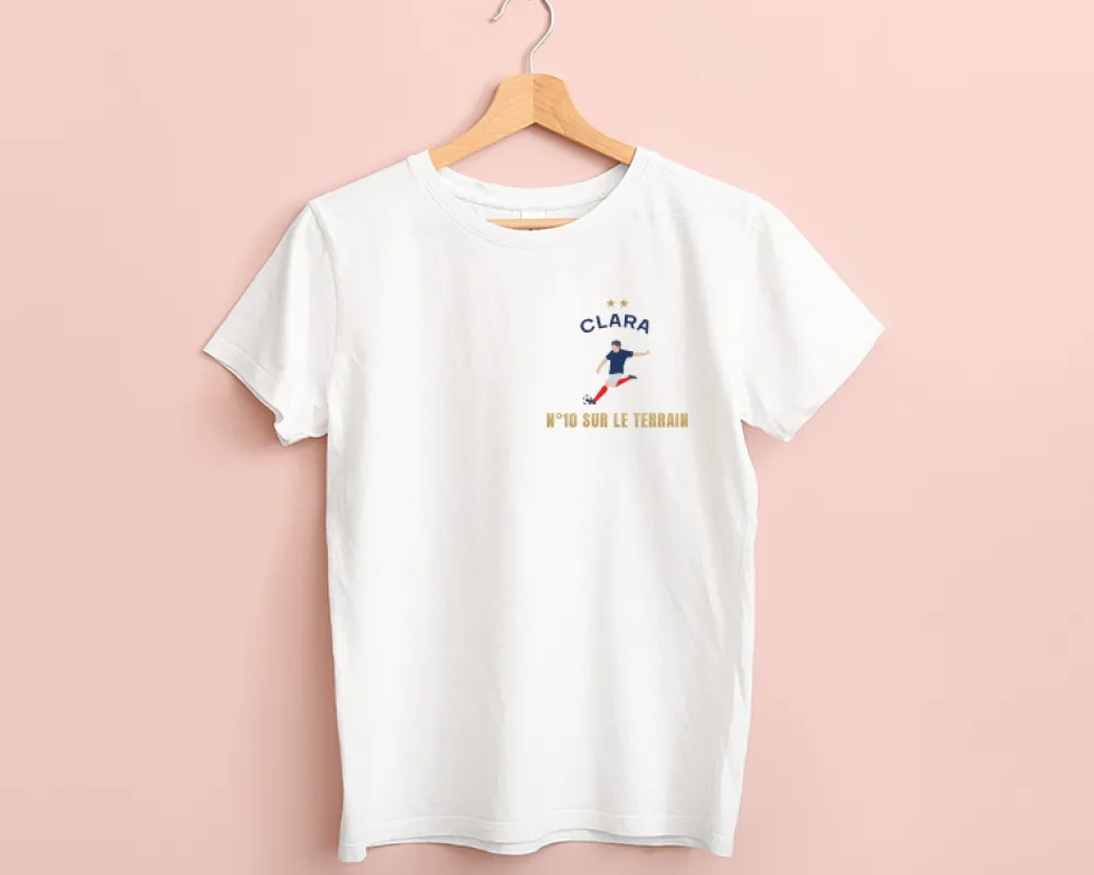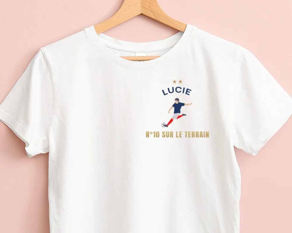Commandez dès maintenant ce t-shirt de football personnalisé pour femme et affichez votre passion pour le football avec élégance. Faites de votre achat un cadeau unique pour vous-même ou un être cher.