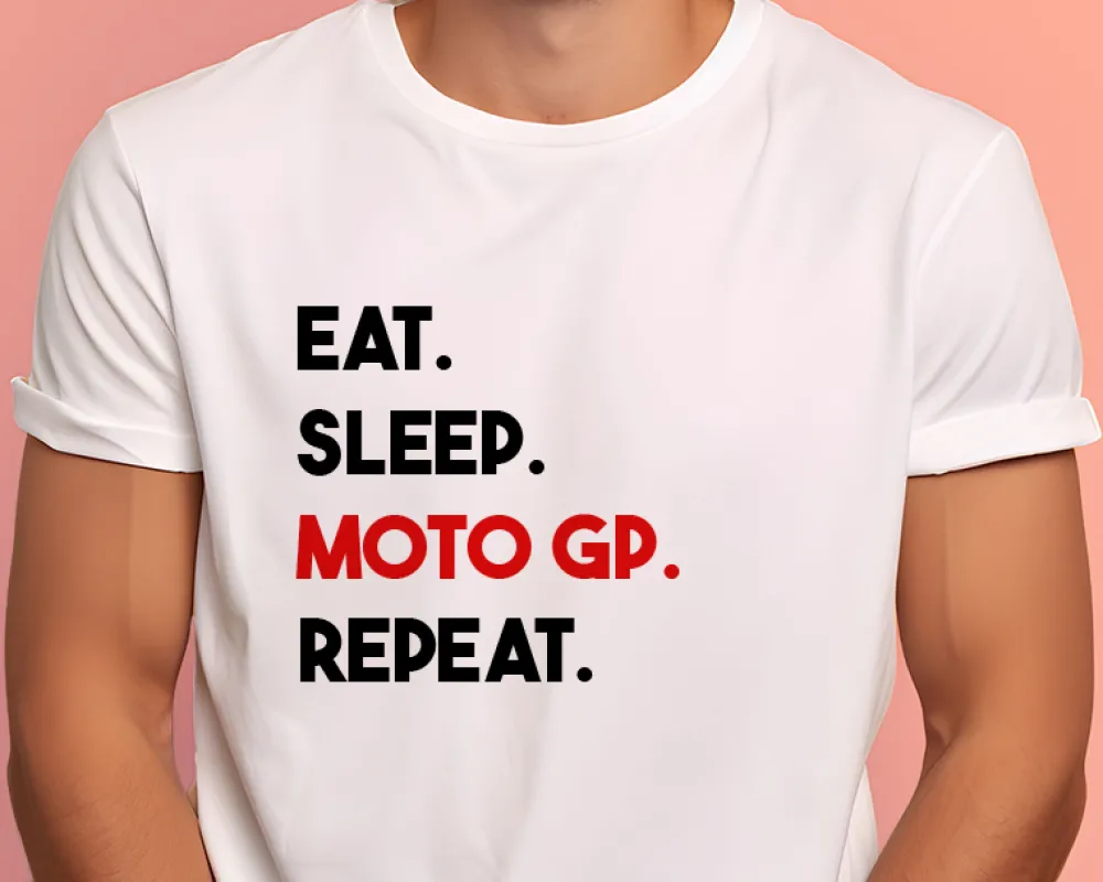 Découvrez notre t-shirt personnalisé pour les fans de moto, arborant un message qui résonne pour tous les passionnés de deux-roues, ou de tout sport mécanique en général. Avec le slogan « eat, sleep, moto, repeat » ce t-shirt moto incarne l’esprit des motards et des fans qui ne se lassent jamais de leur passion.
