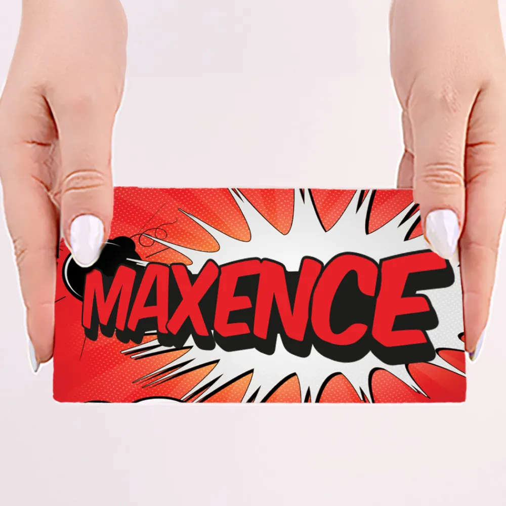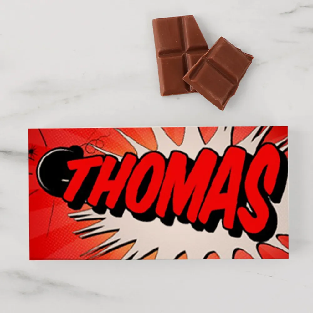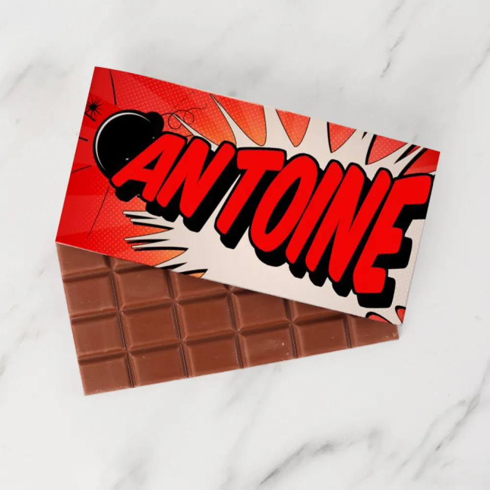 Imaginez… Un super-héros a besoin d’un remontant après avoir sauvé le monde (ou juste après une longue journée !). Que trouve-t-il ? Une tablette de chocolat personnalisée, prête à lui redonner des forces avec son délicieux chocolat au lait ! Son design explosif façon BD et sa personnalisation avec un prénom en font un cadeau unique et fun.