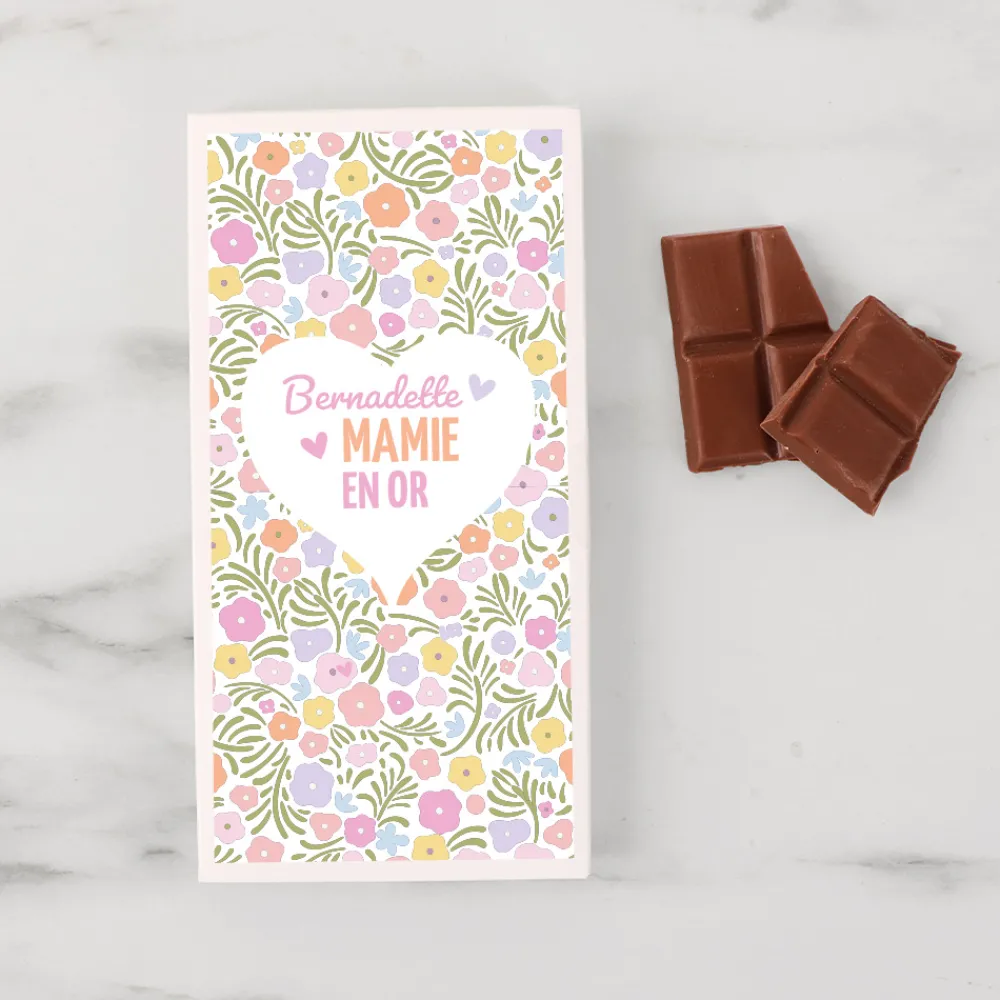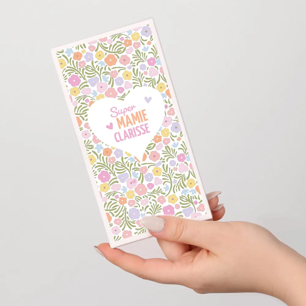 Faites fondre le cœur de votre mamie avec une tablette de chocolat personnalisée, une attention gourmande et pleine de tendresse ! Avec son design fleuri et élégant, elle est parfaite pour lui témoigner tout votre amour à l’occasion de la fête des grand-mères.