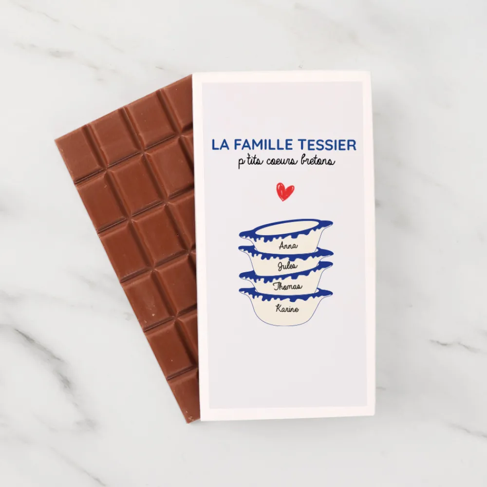 Offrez une tablette de chocolat personnalisée unique qui allie gourmandise et émotion ! Son emballage délicatement illustré avec des bols bretons est entièrement personnalisable avec les prénoms de vos proches, transformant cette douceur en cadeau plein de sens et de tendresse.