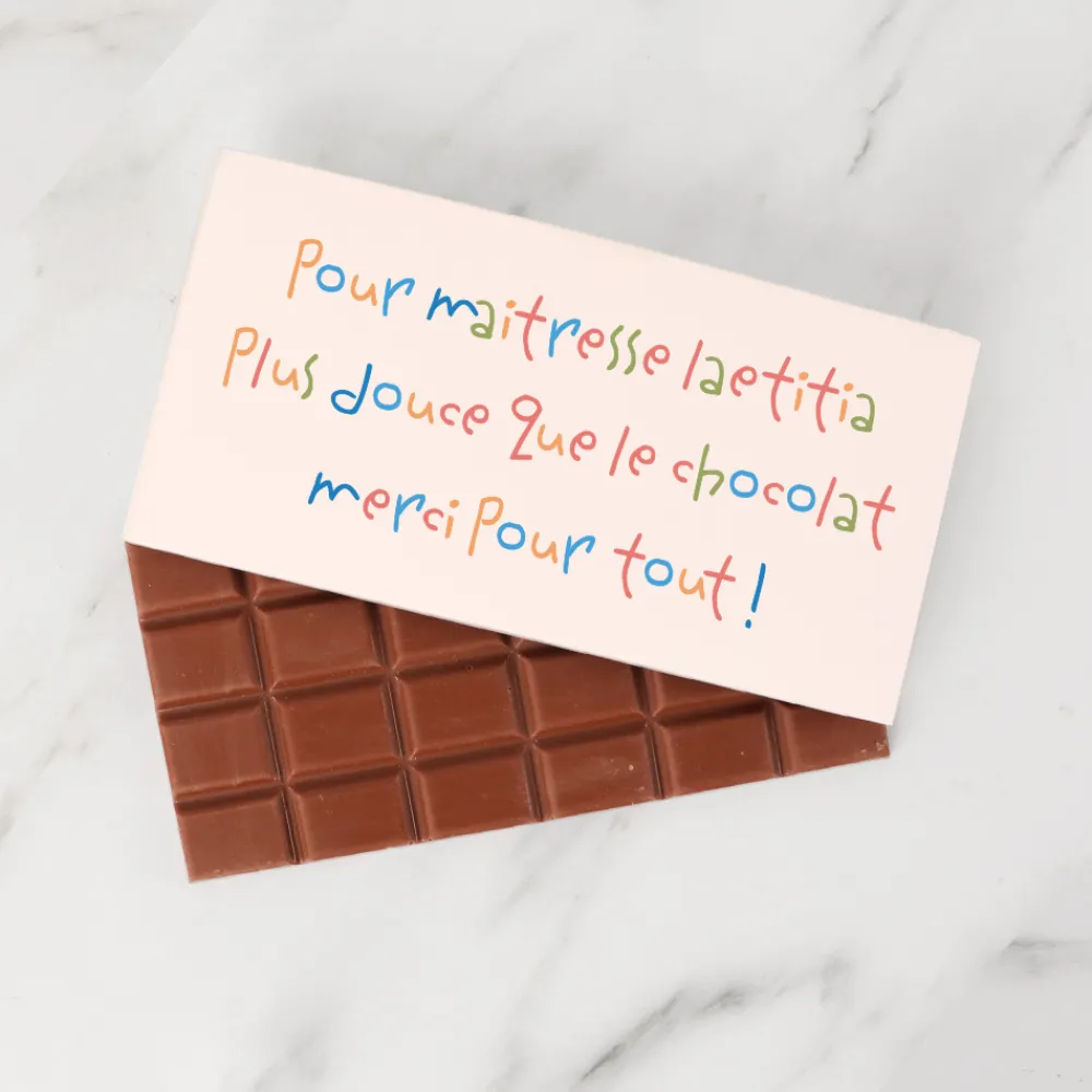 À l’occasion de la fin d’année scolaire, d’un anniversaire ou juste pour dire merci, ce chocolat personnalisé fera briller les yeux de la maîtresse. Les mots d’enfant, simples et tendres, réchauffent le cœur et donnent une saveur encore plus douce à cette jolie tablette.