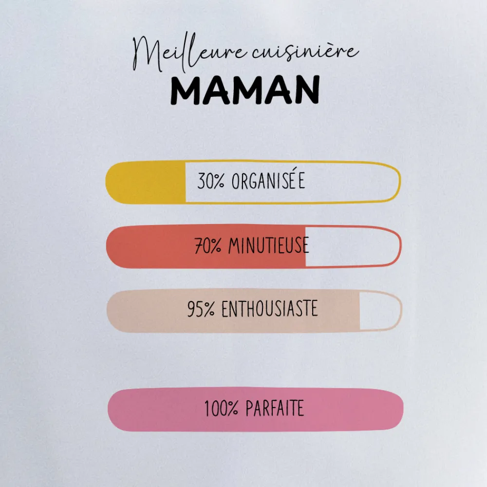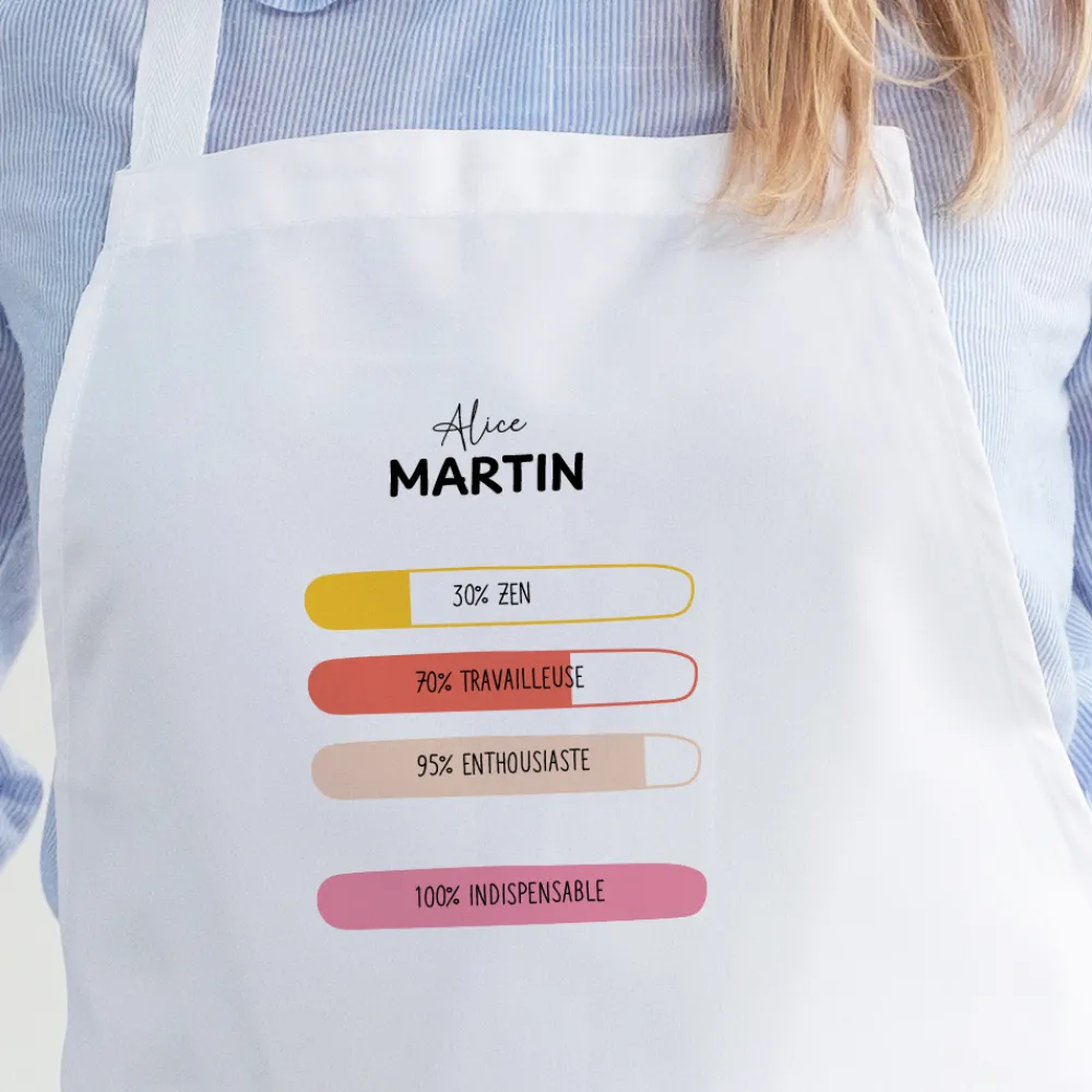 Un tablier qui donne le sourire avant même de cuisiner ! Avec son design coloré en barres de pourcentage, ce tablier personnalisé met en valeur les petites habitudes, passions et traits de caractère de celui ou celle qui le porte. Sportif, gourmand, blagueur, bricoleur… à vous de remplir chaque ligne avec ce qui le rend unique. Les pourcentages restent fixes, mais le message est entièrement personnel !