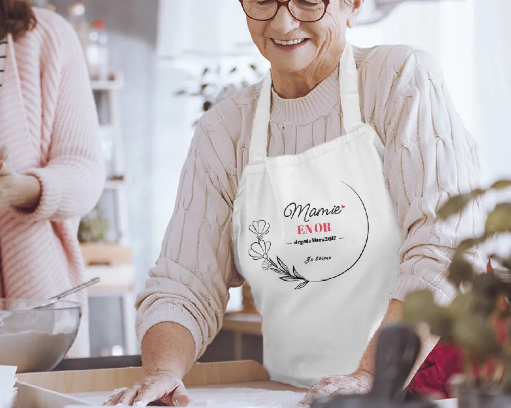 Témoignez toute l’affection que vous éprouvez envers votre mamie en customisant l’un des accessoires de cuisine incontournables qui l’accompagne au quotidien. Offrez-lui ce tablier « Mamie Depuis », personnalisé avec la qualité que vous aimez le plus chez elle et la date à laquelle elle est devenue mamie pour la première fois.