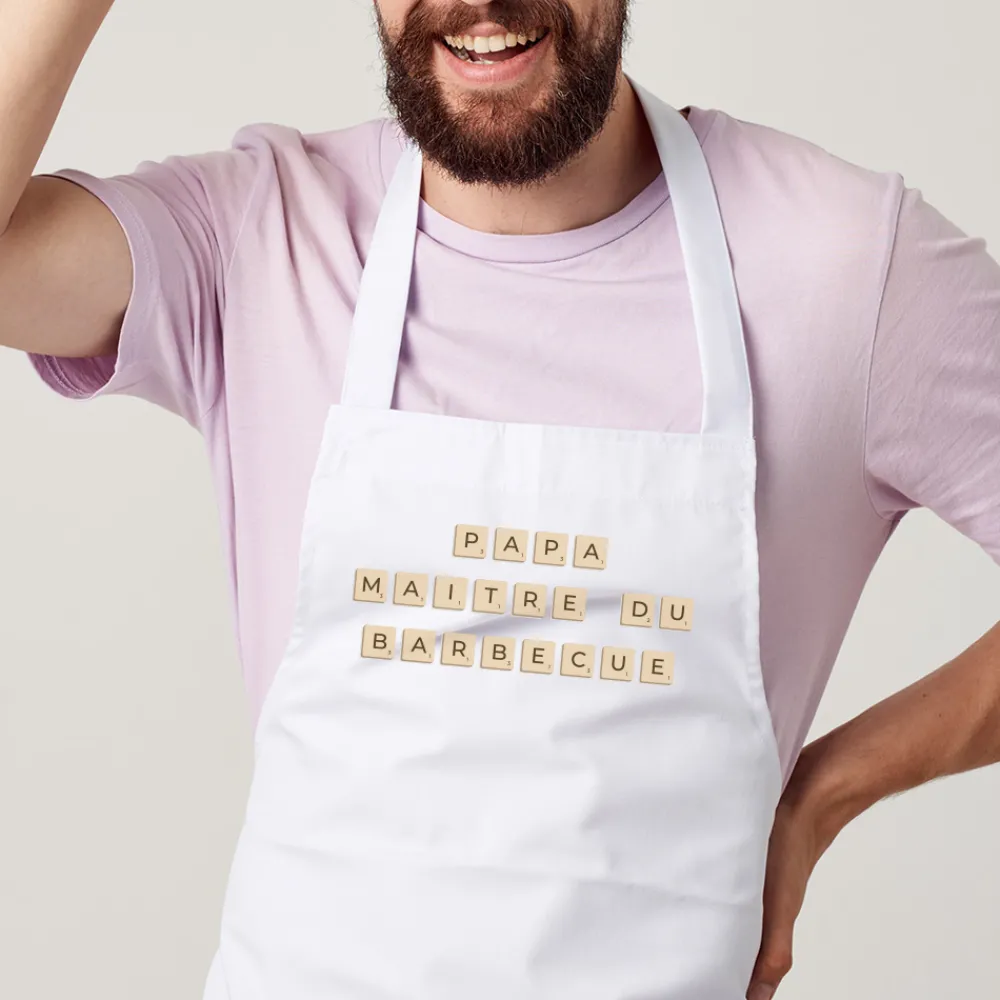 Un brin joueur, résolument affectueux, ce tablier personnalisé façon Scrabble est une idée cadeau qui fait toujours mouche. Grâce à son design ludique et structuré, chaque lettre de votre message apparaît dans une case typographique accompagnée de son petit nombre de points, pour un effet clin d’œil au célèbre jeu de lettres. À personnaliser avec un prénom, un mot doux ou une phrase drôle, ce tablier de cuisine personnalisé devient un objet aussi pratique qu’émotionnel.