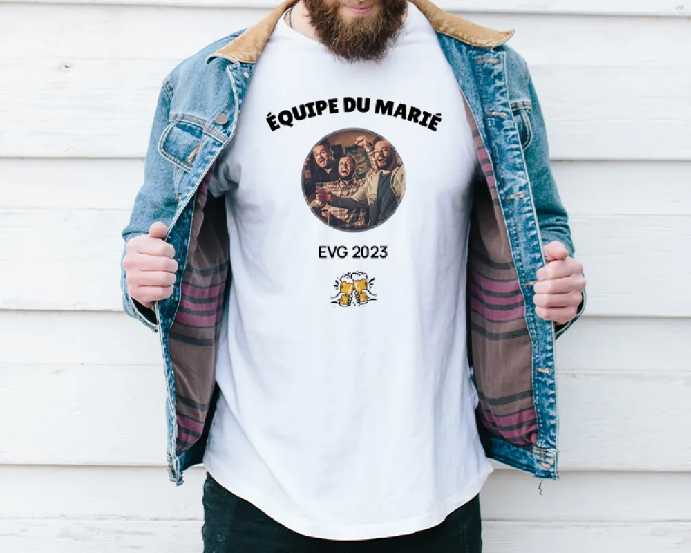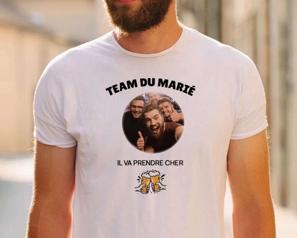 Imaginez tous vos amis arborant fièrement le même t-shirt avec une photo et un message hilarant sur le marié, cela ne manquera pas de donner une ambiance festive et amusante à votre journée !