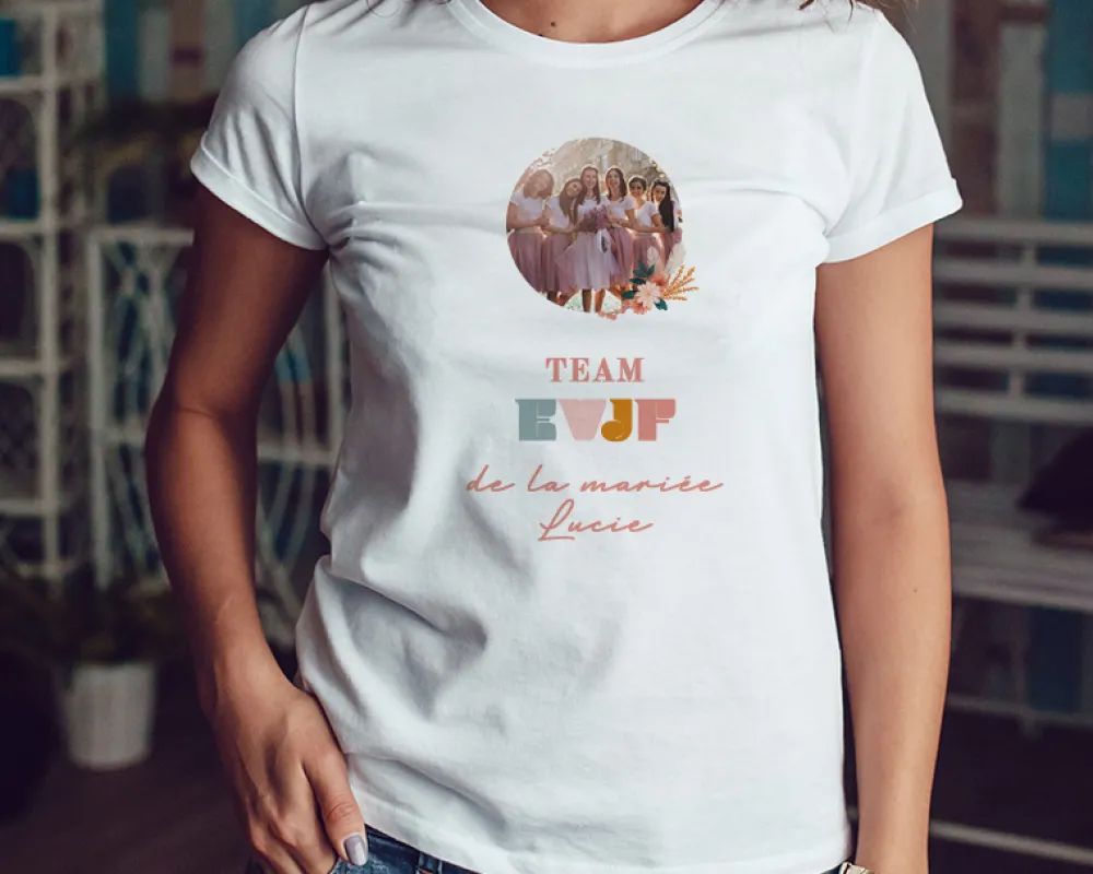 Le design du t-shirt est composé de magnifiques fleurs pastel, ce qui en fait un choix parfait pour l’univers féminin de l’EVJF. De plus, vous pouvez personnaliser ce t-shirt avec le nom des participantes, le nom de la mariée ou une date importante, ainsi qu’une photo pour rendre ce cadeau encore plus spécial.