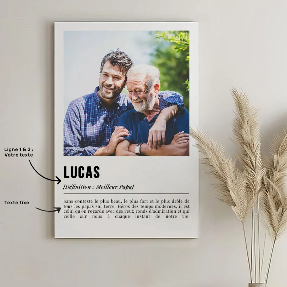 Rendez hommage à votre papa avec une toile personnalisée pleine de tendresse et de fierté. Ce design unique reprend la forme d’une définition pour décrire tout ce qu’il représente : un pilier, un modèle, un héros du quotidien. Grâce à la possibilité d’ajouter son prénom, un mot doux et une photo touchante, ce cadeau devient une déclaration d’amour à afficher chaque jour.