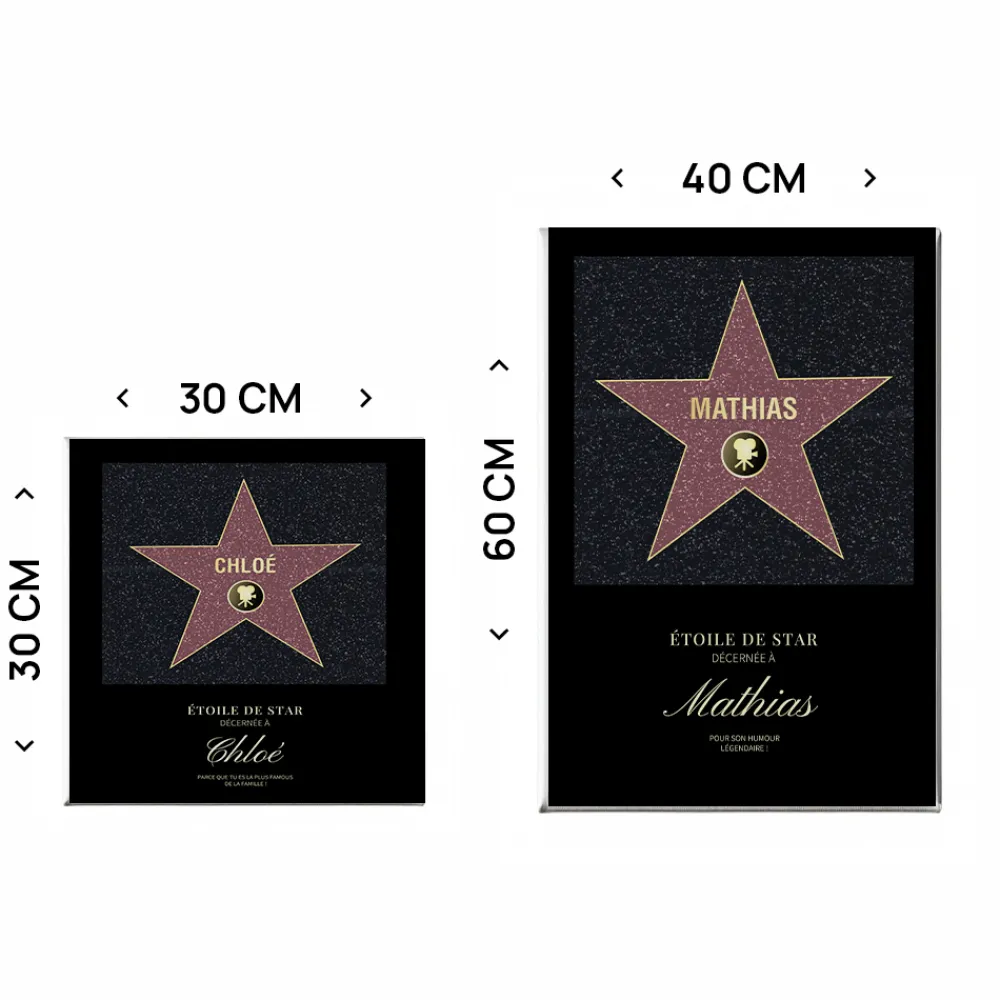 Un soupçon de Hollywood s’invite dans votre intérieur avec notre toile canva Étoile de Star personnalisée. Inspirée du célèbre Walk of Fame, cette création rend hommage à celles et ceux qui comptent vraiment. En format carré ou portrait, cette toile marie humour, émotion et style pour créer un cadeau inoubliable.