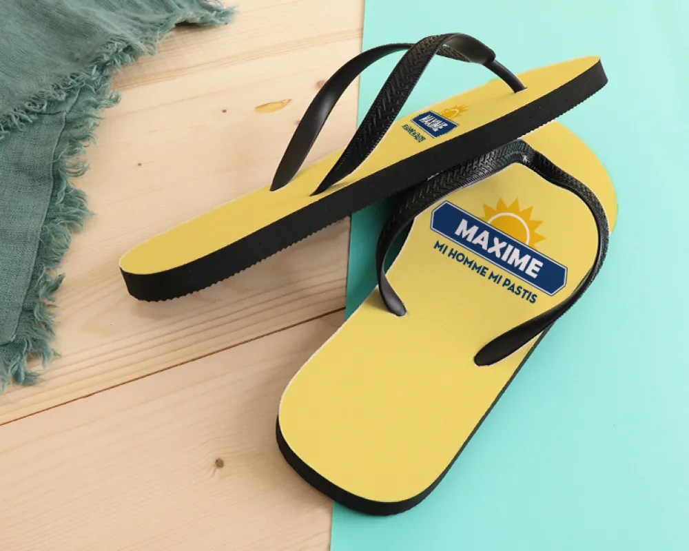 Parfaites pour une promenade décontractée ou une séance de farniente au bord de la piscine, nos claquettes personnalisées avec un design inspiré des symboles emblématiques d’une célèbre boisson anisée française vous garantissent un style unique et plein d’humour. Imaginez-vous, foulant le sable chaud ou se prélassant au bord de la piscine avec vos tongs arborant fièrement votre prénom et un message rigolo tel que « Thomas, roi de l’apéro ».