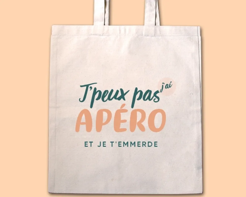 Vous cherchez un accessoire à la fois pratique et sarcastique pour vos apéros entre amis ? Ne cherchez plus, le tote bag personnalisable avec le message « J’peux pas j’ai apéro » est fait pour vous ! Avec sa contenance idéale pour transporter vos bouteilles de vin et autres amuse-bouches, ce totebag deviendra vite votre meilleur allié pour toutes vos soirées. Et si jamais vous avez besoin d’une excuse pour ne pas sortir de chez vous, il vous suffira de sortir votre tote bag en public !