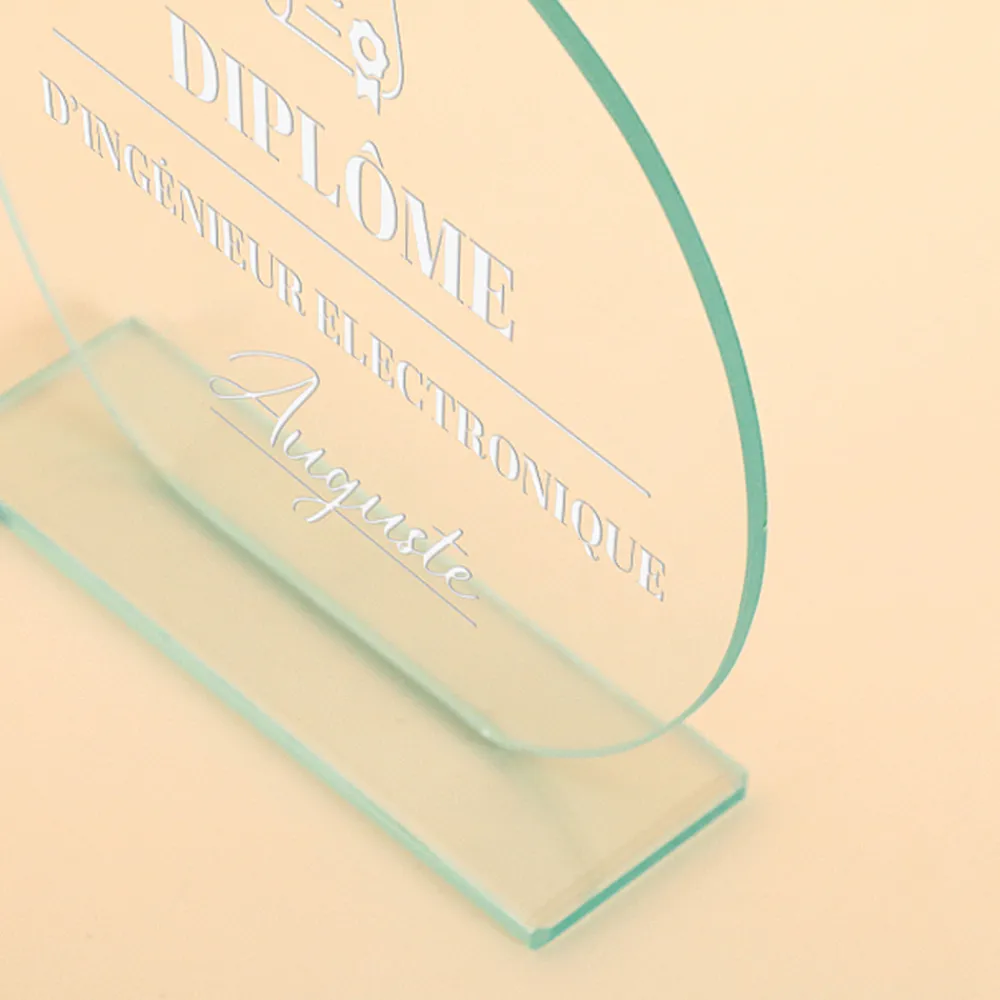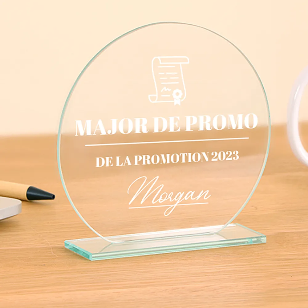 Ce trophée gravé est plus qu’un simple objet, c’est un symbole de reconnaissance et d’appréciation. Fabriqué en verre de haute qualité, il est à la fois rond et transparent, avec un poids de 500g, ce qui lui confère une présence solide et durable.