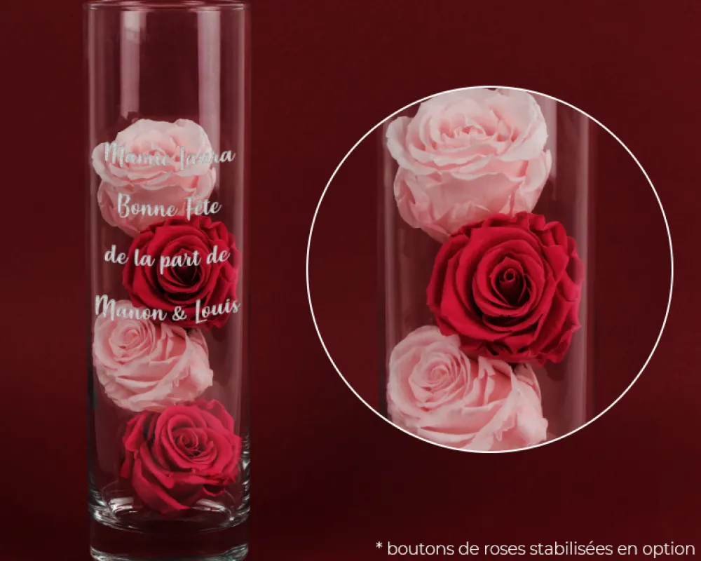 Ce vase à personnaliser en verre possède un fond épais qui lui permet de rester stable, même sous le poids d’un bouquet généreux. Vous pourrez laisser libre cours à votre inspiration, puisque vous avez la possibilité de le personnaliser à votre convenance, avec un message de 1 à 4 lignes. Et pour rendre ce cadeau encore plus exceptionnel, sélectionnez nos fameuses roses éternelles en option, pour lesquelles ce vase transparent servira de jolie vitrine. Il s’agit de boutons de roses stabilisées aux couleurs tendres, qui se conserveront très longtemps, sans soins particuliers.