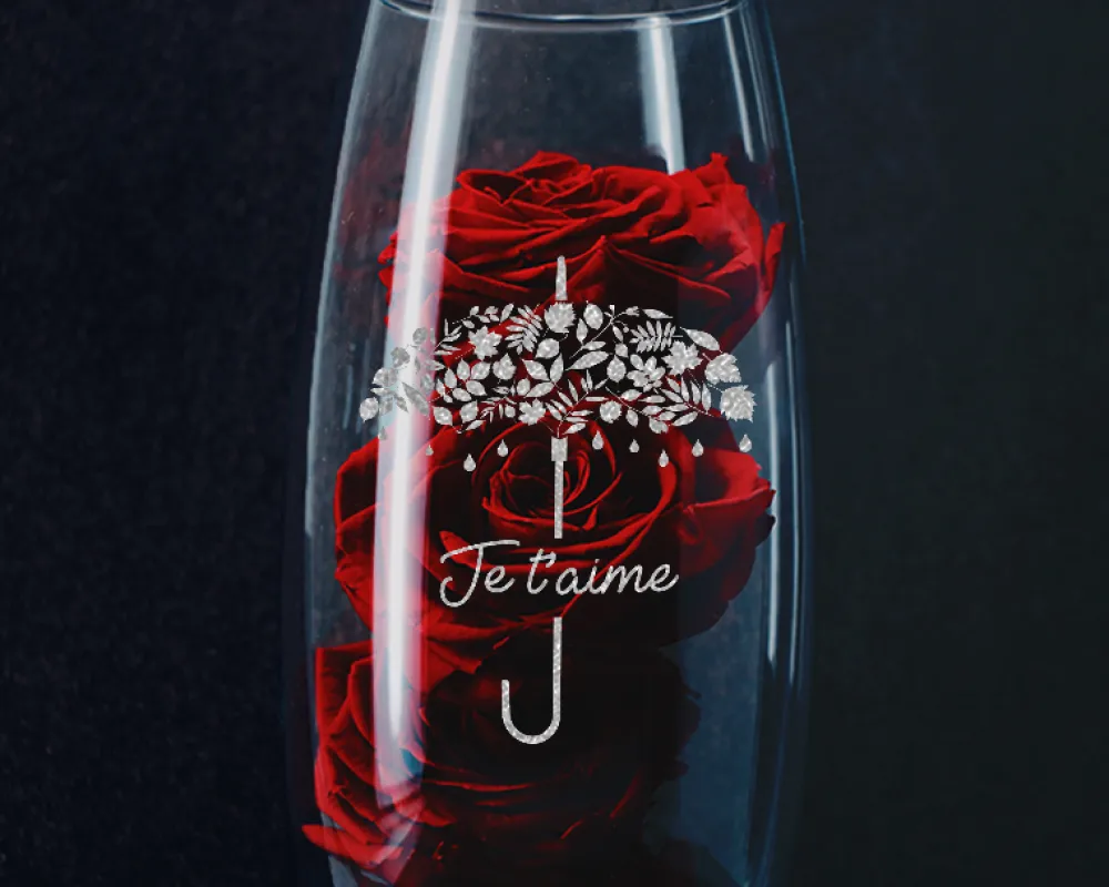 Le vase ovale personnalisable est en verre gravé au laser. Les Roses éternelles de couleur rouge sont naturelles. Cet objet est personnalisé dans nos ateliers français de Laval.